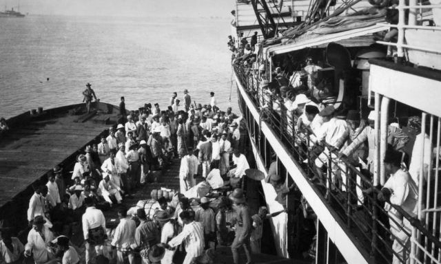 Gevangenen, opgepakt wegens veronderstelde communistische sympathieën, worden geboeid van boord gezet om geïnterneerd te worden in Boven-Digoel.