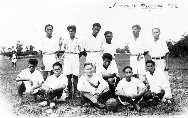 Kamparts Louis Johan Alexander Schoonheyt in het voetbalteam van Boven-Digoel, bestaande uit geïnterneerden en leden van het Binnenlands Bestuur.