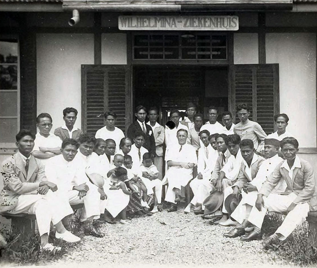 Louis Johan Alexander Schoonheyt (de middelste man) tussen personeel van de malariabestrijdingsdienst en het ziekenhuis in Boven-Digoel.