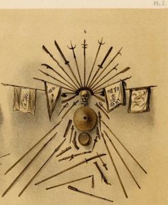 ‘Wat ik in mijn lezing bijvoorbeeld gebruik, zijn objecten en trofeeën die destijds zijn buitgemaakt. In de afbeelding hieronder zien we bijvoorbeeld de “Trophee van Borneo”, met in het midden de schedel van de opstandeling en daaromheen de diverse buitgemaakte wapens en vlaggen.