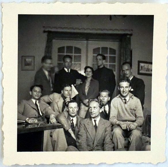 De ‘indo’ Anton Schrader (geheel links) te midden van acht mannen die hij kort daarop met succes naar Engeland zou overvaren. Geheel rechts: de Nieuw-Zeelandse vlieger Mike Mora. (Beeld Fam. Schrader)
