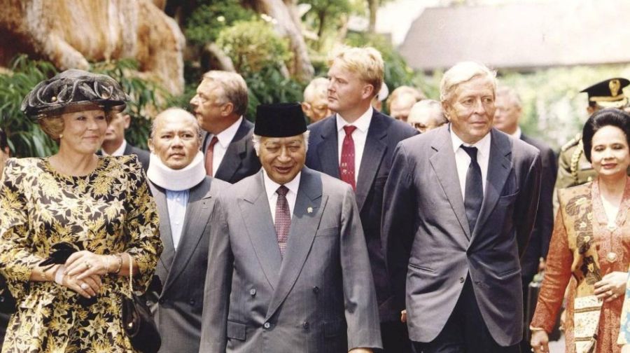 Een foto verhult soms veel. President Soeharto bereidde koningin Beatrix en prins Claus in 1995 geen warme ontvangst. Achter hen minister Van Mierlo van Buitenlandse Zaken en kroonprins Willem-Alexander. Die laatste gaat nu zelf op staatsbezoek in de vroegere kolonie. (ANP, Cor Mulder)
