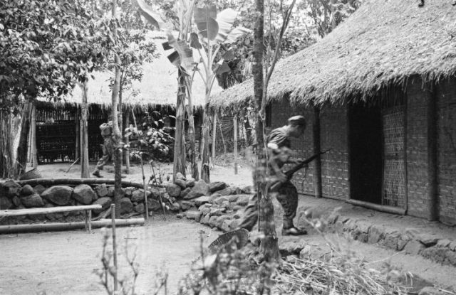 Nederlandse militairen doorzoeken nabij Soerabaja (Oost-Java) een kampong in juli 1947, tijdens de eerste ‘politionele actie’. (NA)