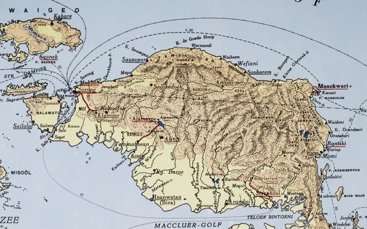 Vogelkop en Kais-rivier met kampong Baroe (midden onder)