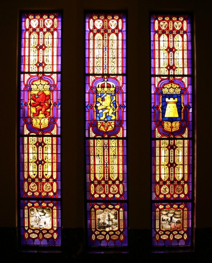 Drie glas in lood ramen in het trappenhuis van het gemeentehuis, geschonken door de Indische planterTeun Ottolander.