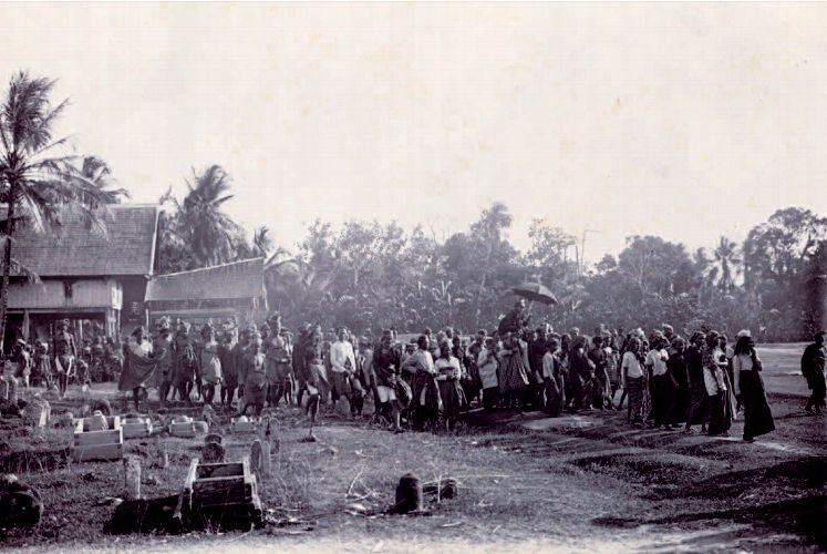 Afb. 10 Beschrijving van Goldman: ‘Vorstin van Rappang, Andi Beda, met gevolg op weg naar het bivak ten einde ontmoeting van den radja van Sidenreng met overste van Bennekom voor te bereiden.’ Volgens gebruik in Zuid-Celebes werd een vorstin op één schouder van een onderdaan gedragen en tegen de zon beschermd door een parasol of, zoals de foto duidelijk laat zien, een gewone paraplu. (Legermuseum Delft)
