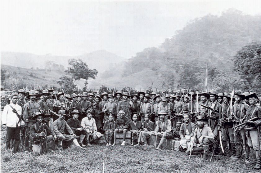 Afb. 12. Foto 18 november 1905. De gevangengenomen vorst van Boni die de linkervoet in het verband heeft, met de drie vrouwen die hem vergezelden. Recht achter de vorst 1e luitenant Eilers en links van Eilers sergeant Marks. (Legermuseum Delft)