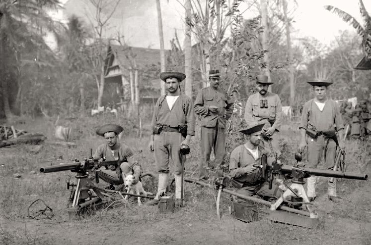 Afb. 8. ‘Masepe [september 1905, luitenant ter zee 2e klasse] de Beaufort [met verrekijker] met zijn beide 3.7 cM’ [stukken snelvuur]. De twee geknielde schutters houden ieder een patroon in de hand. De kanonnen, die ook aan boord konden worden gebruikt, zijn geplaatst op een affuit, de zogenaamde stoel klein, die 127 kg weegt. (Legermuseum Delft)