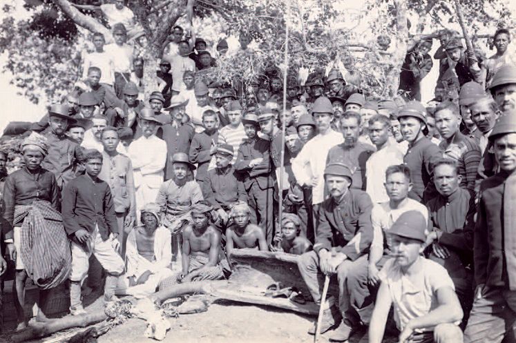 Afb. 9. Beschrijving van Goldman: ‘In de veroverde benteng Onakaë. De eerste teekenen van onderwerping. Aankomst van een gezantschap uit Masepe.’ Tweede links van stok is Goldman. De gehurkte Europeaan in de voorgrond draagt zijn helmhoed achterste voren waardoor de achterrand dienst doet als een zonneklep. De staande KNIL-onderluitenant met bamboehoed, die rechts van de besnorde Europeaan in een wit pak staat, draagt in zijn bovenste knoopsgat de verkleinde draagmedaille van de Militaire Willemsorde der vierde klasse (MWO4).