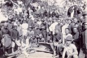 Afb. 9. Beschrijving van Goldman: ‘In de veroverde benteng Onakaë. De eerste teekenen van onderwerping. Aankomst van een gezantschap uit Masepe.’ Tweede links van stok is Goldman. De gehurkte Europeaan in de voorgrond draagt zijn helmhoed achterste voren waardoor de achterrand dienst doet als een zonneklep. De staande KNIL-onderluitenant met bamboehoed, die rechts van de besnorde Europeaan in een wit pak staat, draagt in zijn bovenste knoopsgat de verkleinde draagmedaille van de Militaire Willemsorde der vierde klasse (MWO4).