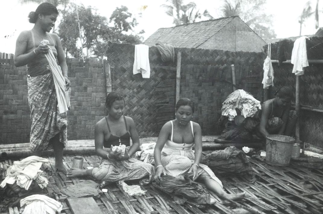 Vier baboes tijdens het wassen van kleding van Nederlandse militairen, 1949. [NIMH 2155_019053]