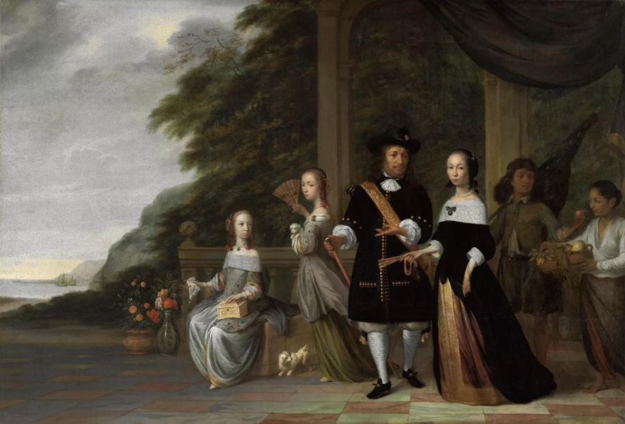 Untung Surapati, de latere nationale held van Indonesië, links in de schaduw achter zijn bezitter, Pieter Cnoll en diens gezin en nog een tot slaaf gemaakte bediende. Schilderij van Jacob Coeman uit 1665. [Collectie Rijksmuseum]