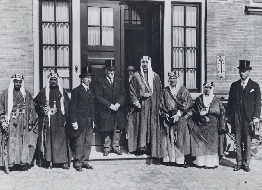 Bezoek aan de Universiteit Leiden van kroonprins Sa’ud van Saudi-Arabië, met Dr G.F. Pijper, Dr Nidhat, onderminister van Buitenlandse Zaken Fu’ad Hamza, de prins, prof. C. Snouck Hurgronje, prof. A.J. Wensick en twee lijfwachten, 1935. [KITLV]
