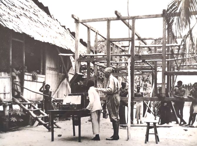 Jaap Kunst neemt in 1932 de muziek op van een nog onbekende persoon in het dorp Urbinasopèn, Waigéo, een eiland voor de kust van West-Papoea. [Jaap Kunstarchief, Amsterdam]