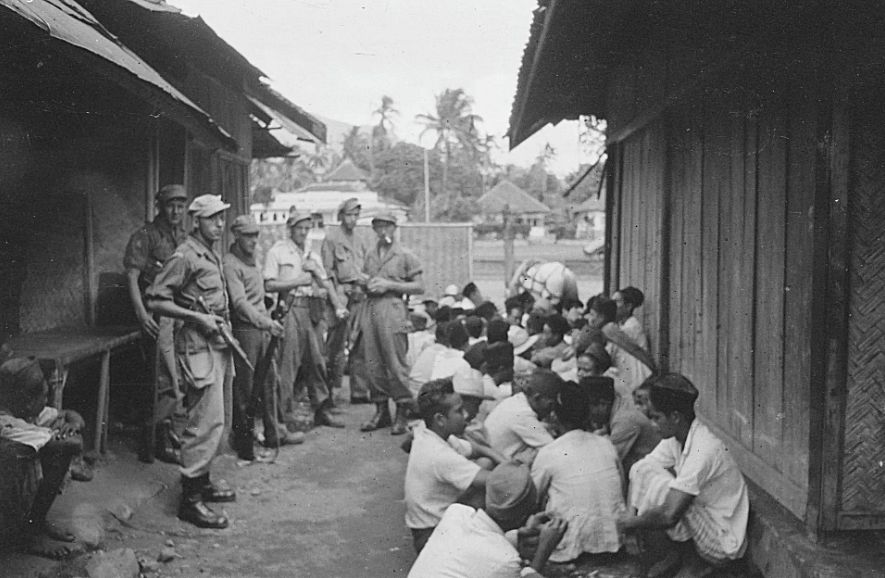 Een Nederlandse patrouille heeft in september 1947 Indonesiërs gevangen genomen in de buurt van Cheribon. Volgens het originele bijschrift zijn ze „in afwachting van het verhoor.”