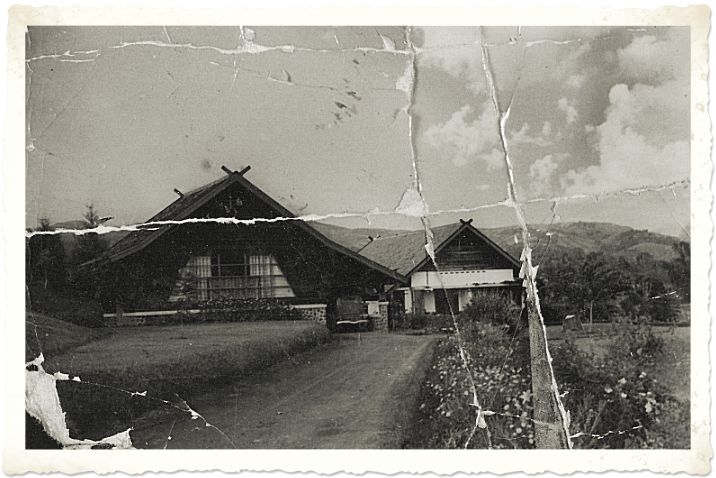 Gescheurde zwart-wit foto van het huis en atelier van Hal Wichers, najaar 1945. © Tjieke Deuss-Wichers.