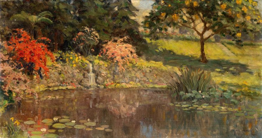 Hal Wichers, Tuin met vijver bij zijn huis in Ciumbuleuit, Bandung, 1939, olieverf op doek, gesigneerd en gedateerd rechts onder. Dit werk was in bezit van zijn familie in Nederland en tijdens de oorlog veiliggesteld. © collectie Tjieke Deuss-Wichers.