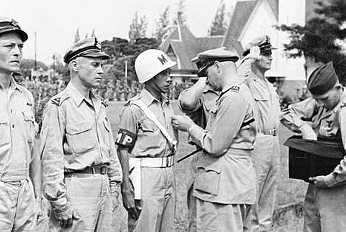 Generaal Spoor reikt een onderscheiding in de Orde van de Bronzen Leeuw uit in Batavia, mei 1946