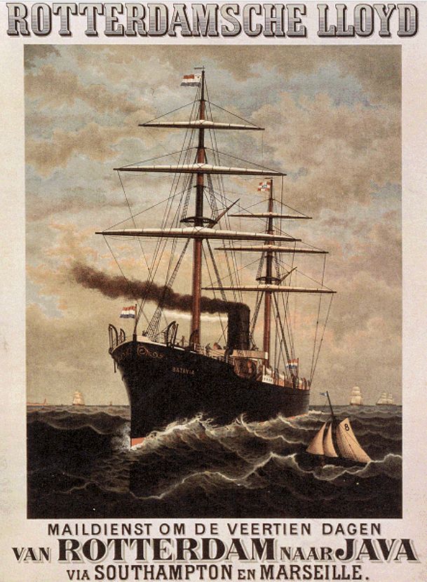 Affiche uit 1883 van de Rotterdamsche Lloyd waarop is afgebeeld de in dat jaar door de Koninklijke Maatschappij de Schelde gebouwde mailboot Batavia.
