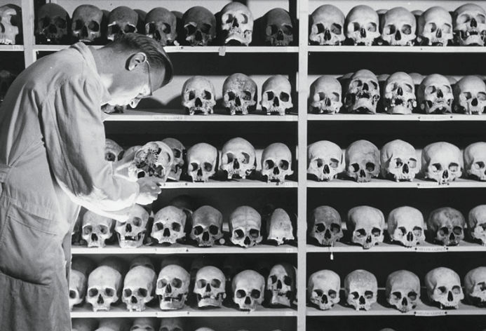 Schedels afkomstig uit Nieuw-Guinea in een depot van de Afdeling Culturele en Physische Anthropologie (CPA) van het Koninklijk Instituut voor de Tropen.
